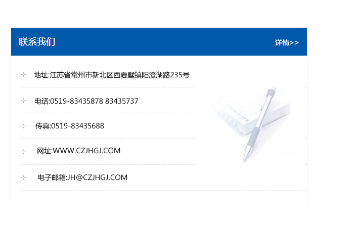 地址:常州市新北區友邦商務大廈1幢16、17層  電話:0519-85101652  傳真:0519-85112595  郵編:213022  網址:www.cz-jiayue_cn.hhdjart.com  郵箱:xiajifengaa@163.com